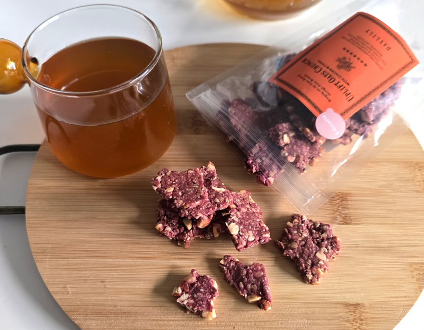 鮮やかな紅色の生地に黒糖と生姜を掛け合わせた、見た目にも温もり感じる秋冬にぴったりなオーツクッキー。