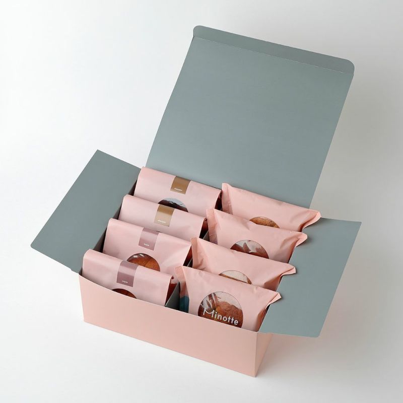 ブレッド4種(塩、くるみ、ごま、紅茶)8個とスイーツブレッド2種(あんぱん、チョコパン)4個をミノッテカラーのピンクのかわいいボックスに入れて、幸せをお届けします。大切な方へ想いを込めた贈り物にどうぞ。