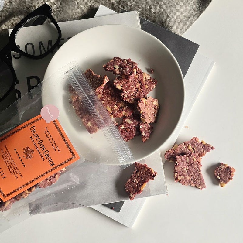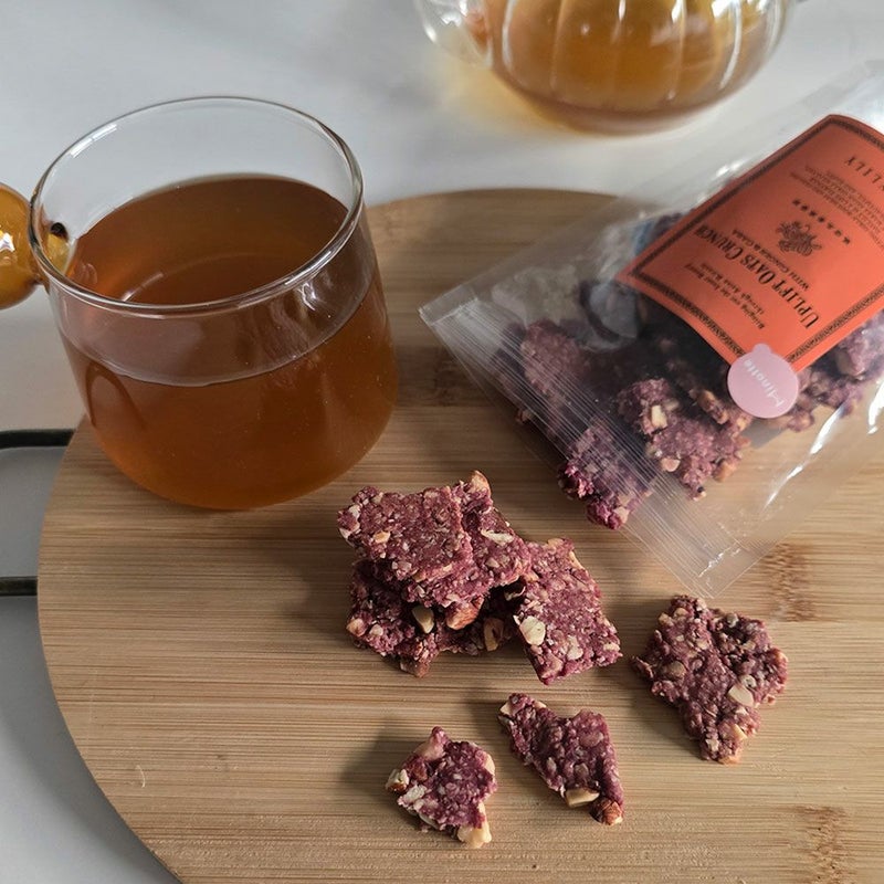 台湾発の漢方ライフスタイルブランド「DAYLILY」とMinotte「オーツクッキー」のコラボ商品第二弾!台湾で古くから健康習慣として親しまれてきた「黒糖生姜茶」をイメージしたオーツクッキーです。ザクザク食感とともに黒糖のやさしい甘みと生姜の心地よいスパイシー感が広がり、じんわりとぽかぽか気分に。女性に嬉しいたんぱく質とGABAも補える、ギルトフリーなおやつです。